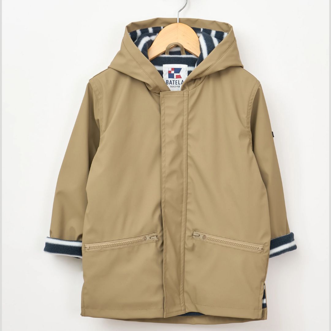 Chubasquero unisex forrado con forro polar rayado. Bolsillos con cierre de cremallera.