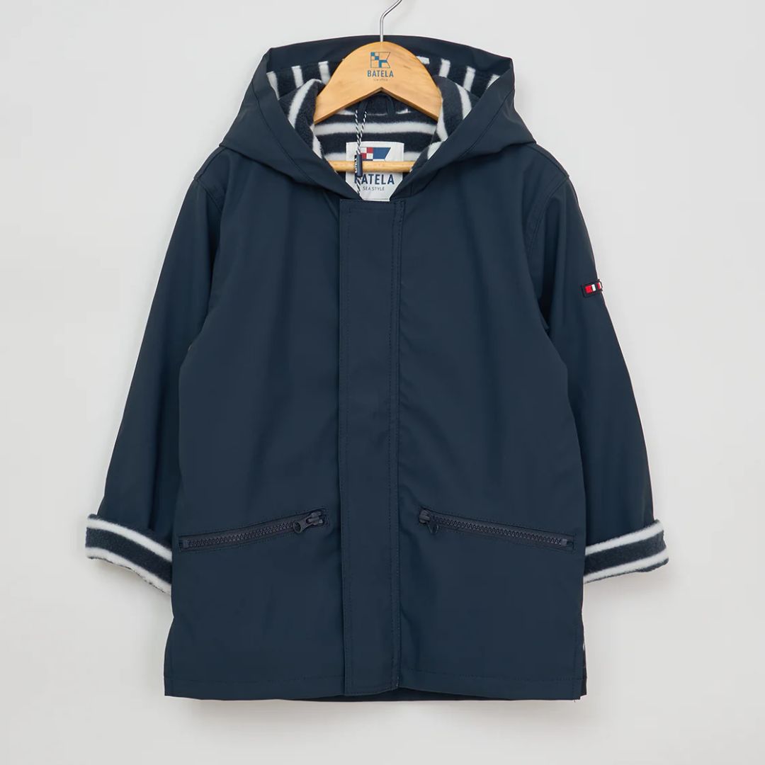Chubasquero unisex forrado con forro polar a rayas. Bolsillos con cierre de cremallera.